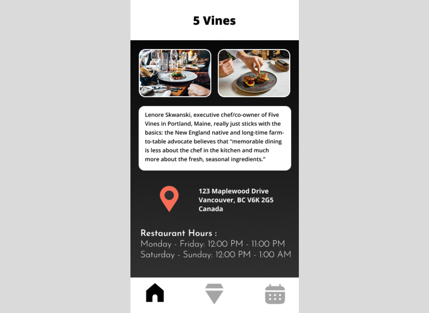 Created low-fidelity layouts for restaurant listing, menu, and booking flow.