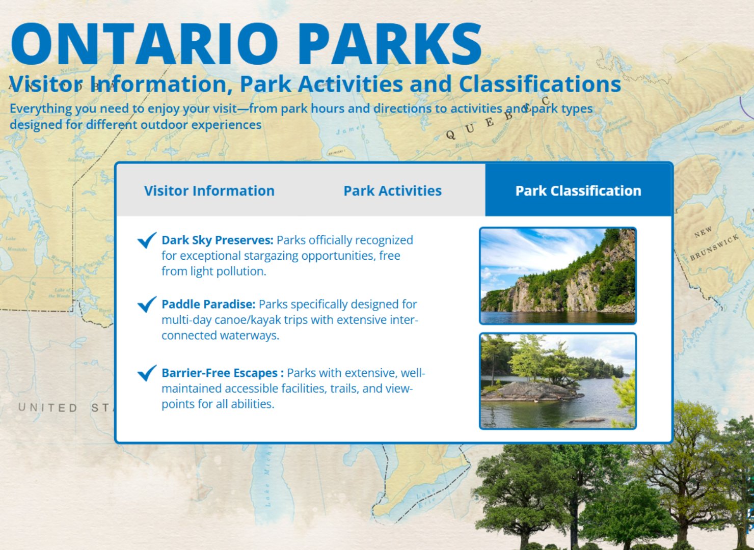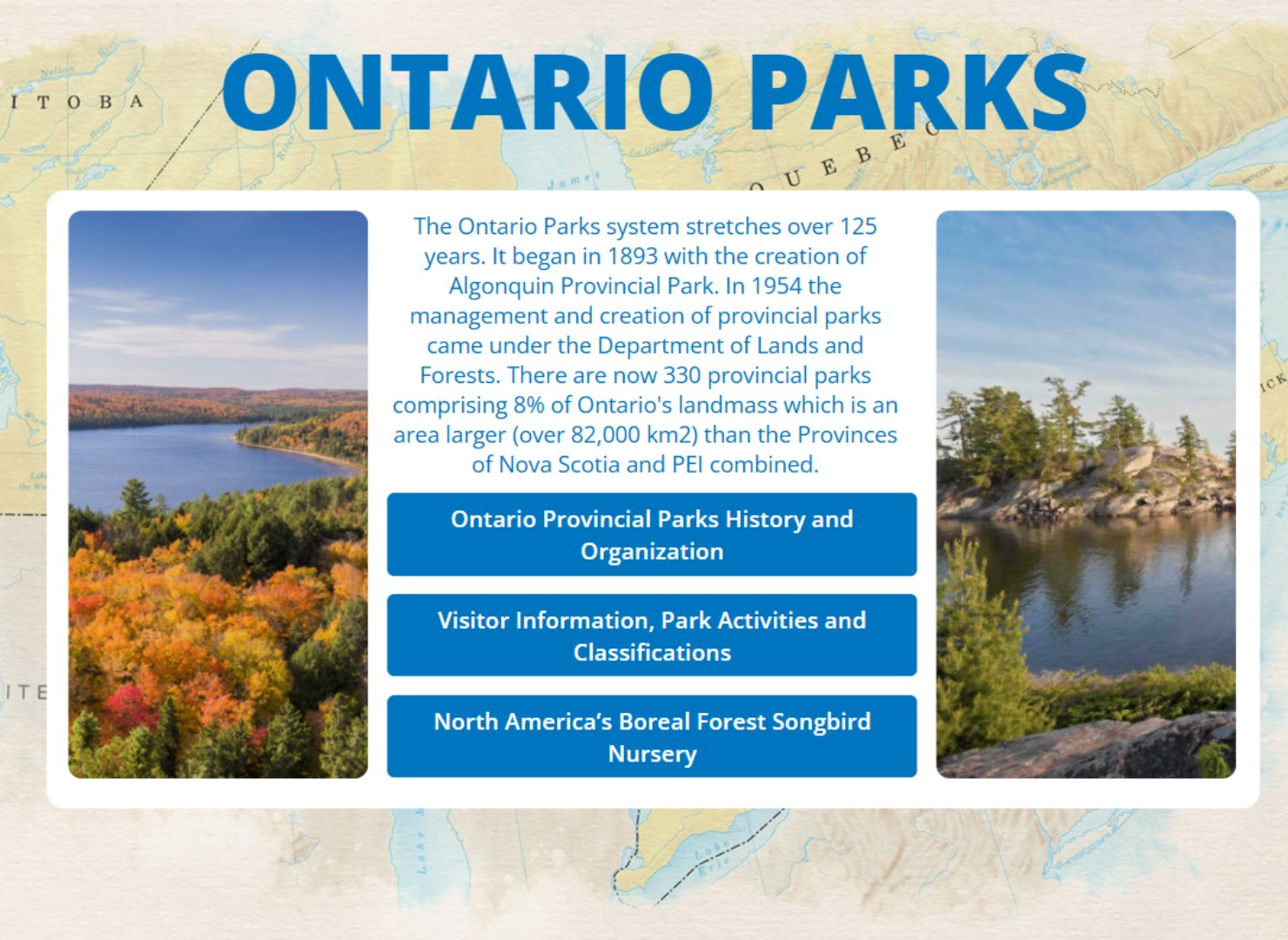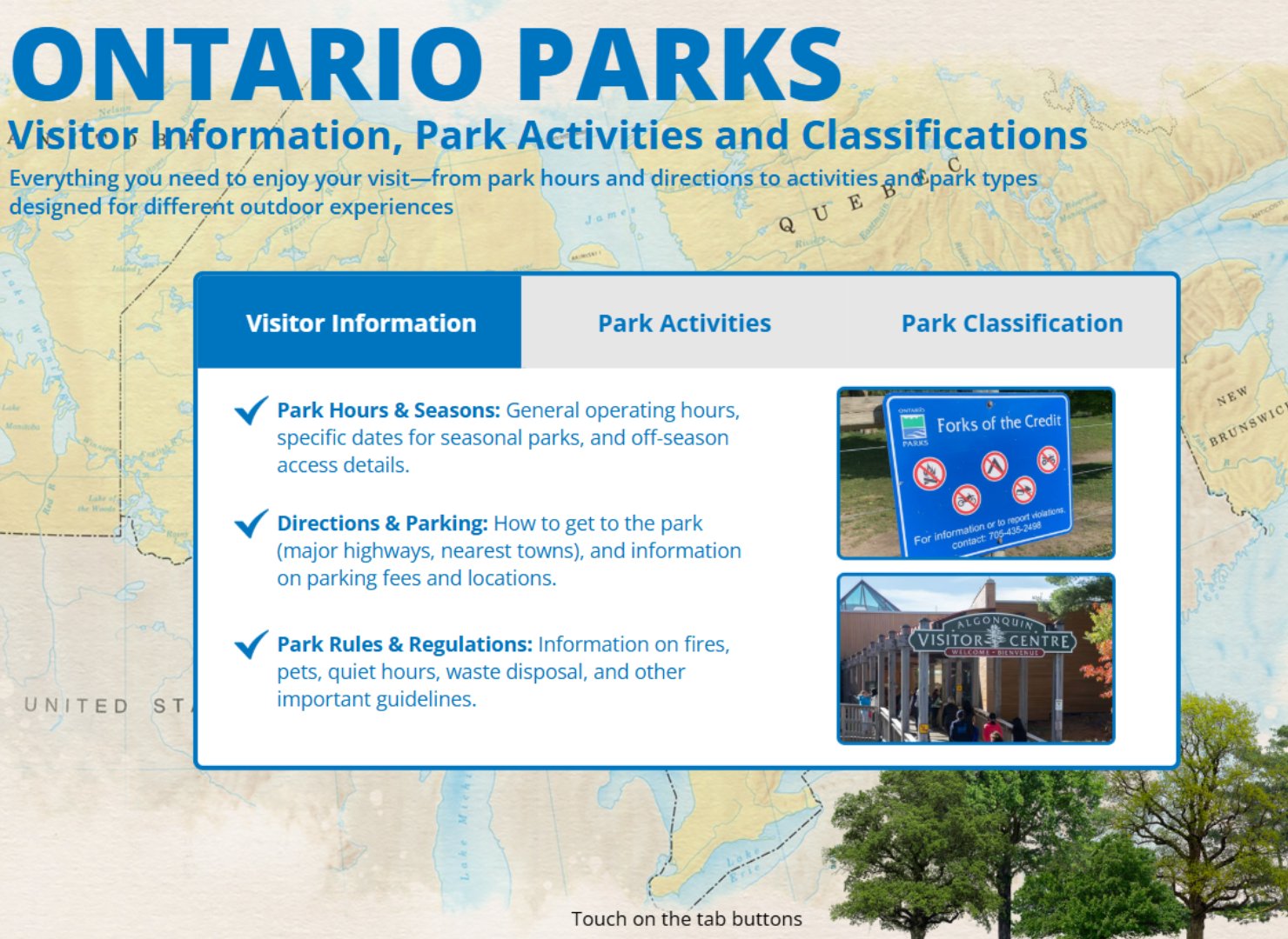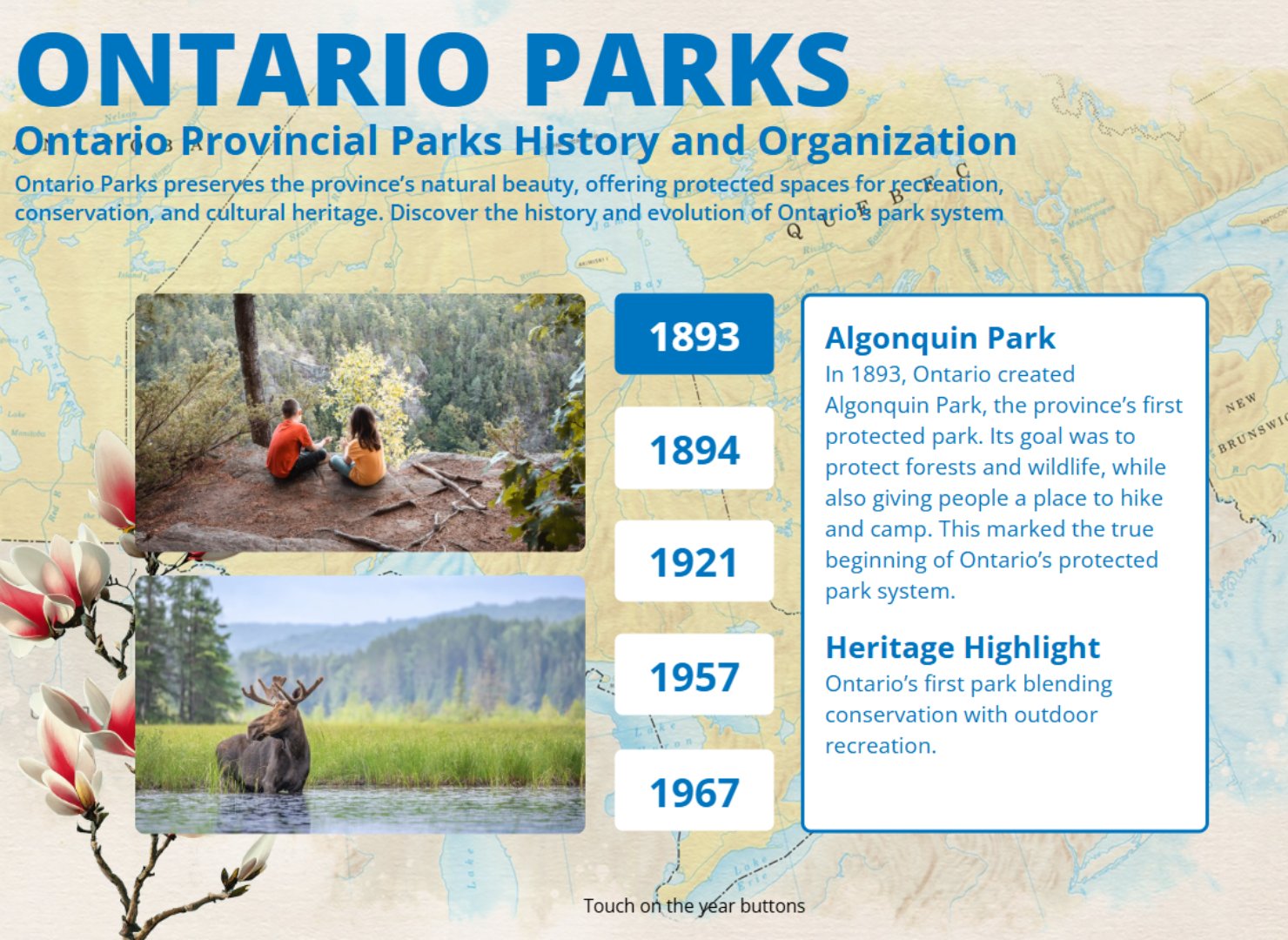 A touchscreen-based interactive experience designed to educate visitors about Ontario Parks, featuring history timelines, visitor information, and engaging wildlife content.